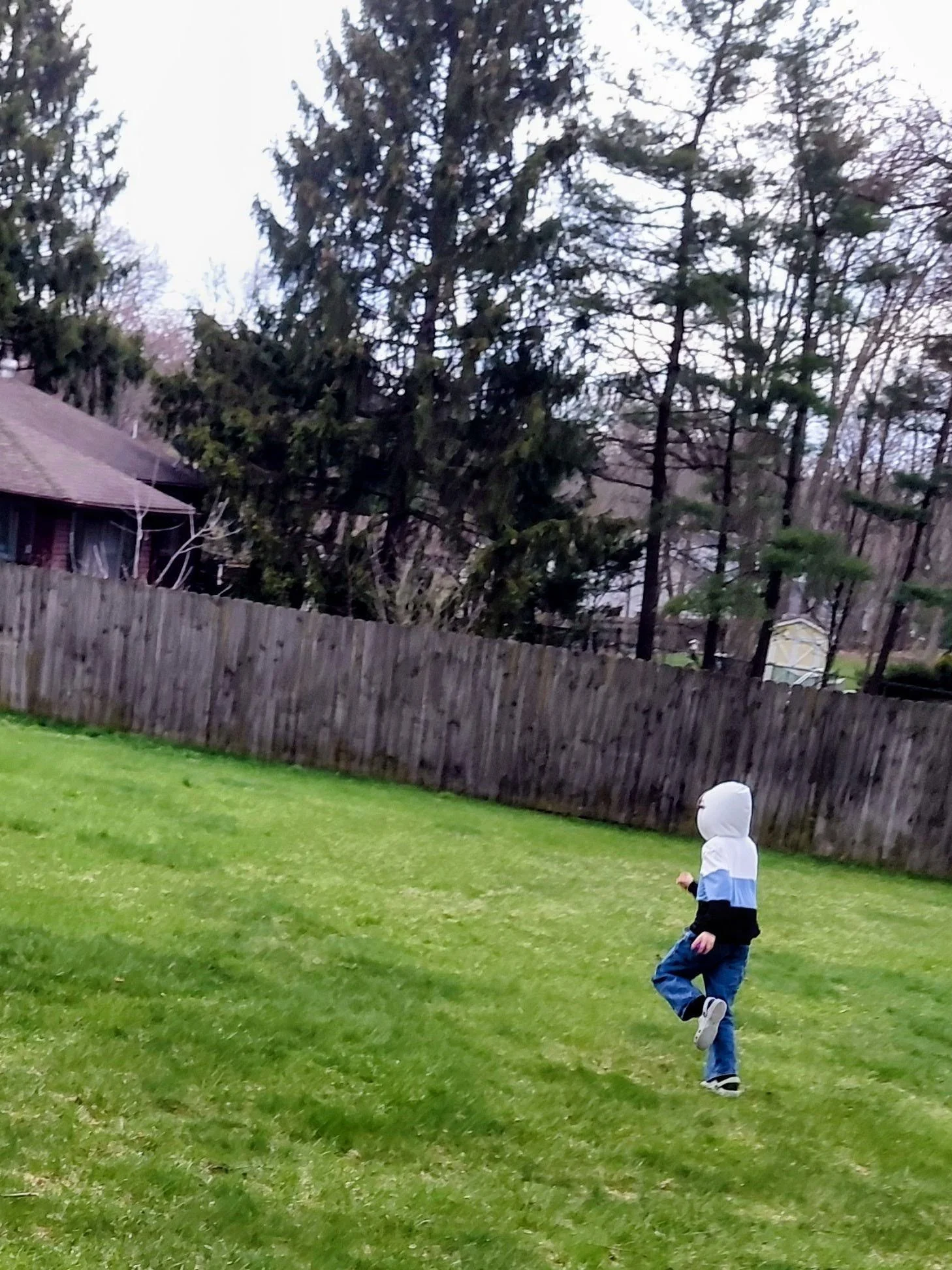 (Image description: My son, wearing a hoodie sweatshirt and jeans, runs across our backyard on an overcast spring day with his back to the camera. A wooden fence and tall evergreen trees stretch out behind him.)